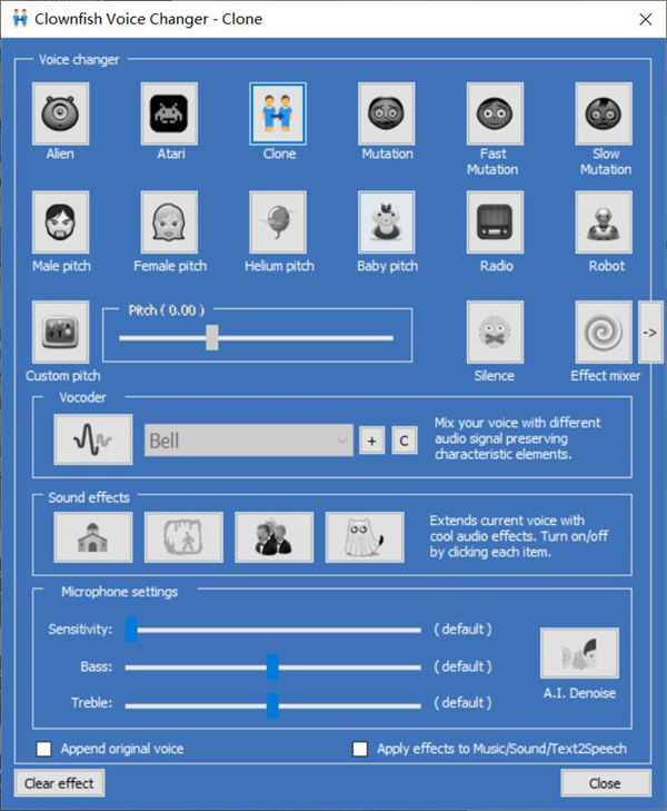 Clownfish Voice Changer小丑鱼变声器拥有非常便捷的使用方式,能与许多热门语音程式如Discord、Steam、Team Speak、Skype等配合使用,让我们的聊天过程变的更加有趣,拥有各种恶搞的元素。