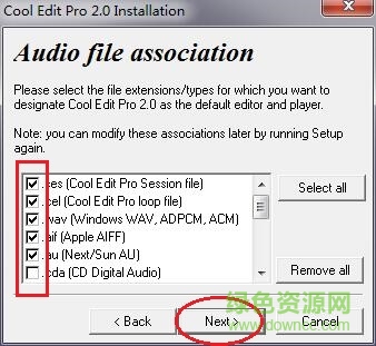 4.选择关联的音频文件格式,勾选后点击“next”