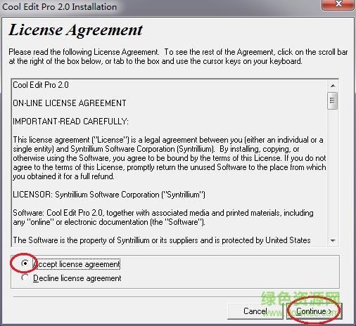 2.开始安装界面是英文的,别担心,按小编的指示进行操作,选择“Accept license agreement”,点击“Continue”按钮