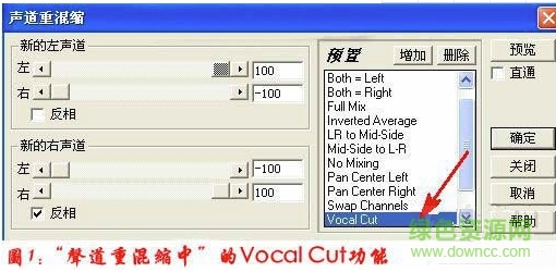 2.打开音频后选择“效果”→“波形振幅”→“声道重混缩”,在打开的窗口中选择“预置”里面的“ Vocal Cut ”见(图 1 ),保持对话框上的默认设置,点“确定”按钮。经过 CE 处理后,就得到了《命中注定》这首歌的伴奏音乐了。