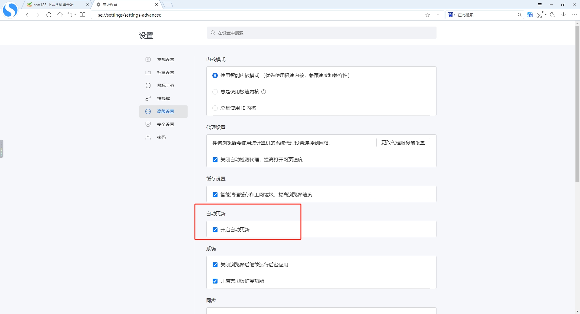 4、在高级设置中看到自动更新这一栏,将【√】关闭掉以后就不会自动更新了。