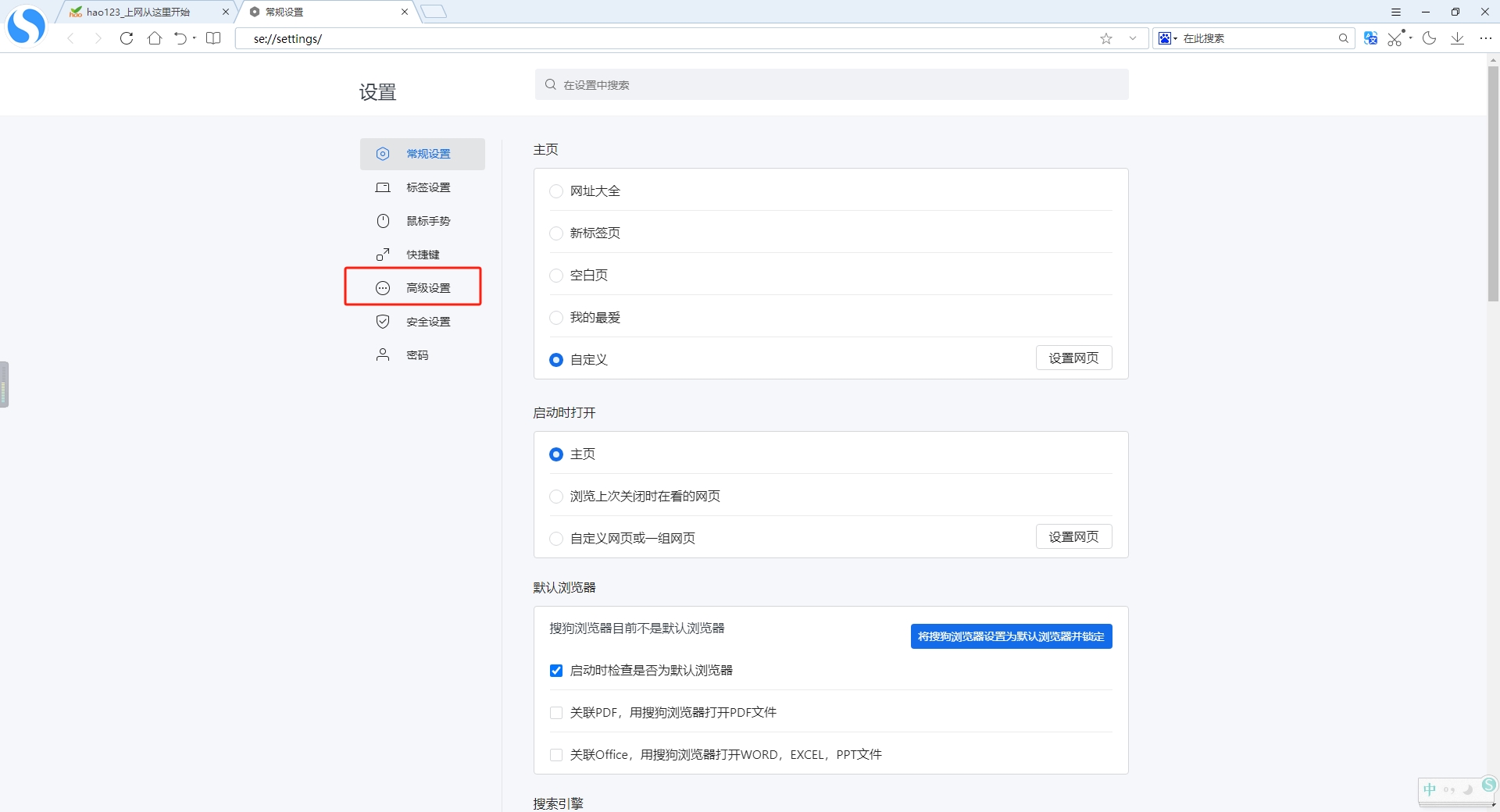 3、进入设置页面可以看到有多个设置项目,我们选择【高级设置】;