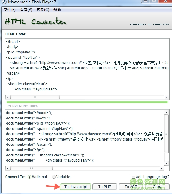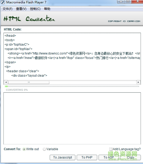 html转js转换器(HTML Converter)是一款非常好用的编程工具,能一键将html文件转换为javascript文件,方便快捷,不懂JS代码都能用,还支持转换php和ASP,软件绿色无毒,无需安装就能放心使用,喜欢的朋友可以来绿色资源网下载!