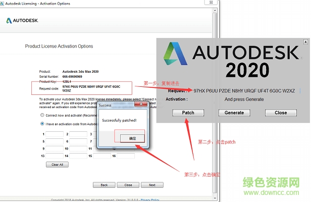 2.复制注册码→点击patch→点击确定,如图所示操作进行