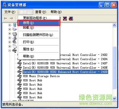 在“设备管理器”窗口中,依次点击“操作”→“停用”。如图 5 停用 USB 2.0 控制器所示: