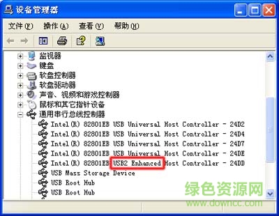 在“设备管理器”窗口中,展开“通用串行总线控制器”主项,点击“USB2 Enhanced”子项。如图 4 USB 2.0 子项所示: