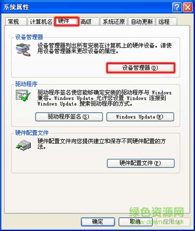 在“系统属性”窗口中,从“硬件”选项卡中点击“设备管理器”按钮。如图 3 系统属性所示: