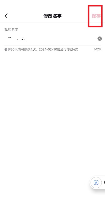 4、修改界面之中我们可以修改任意的名字,重复也没有关系,但是需要注意的是一个月内仅能修改4次,不能超过,修改好名字之后就可以点击右上角的【保存】保存修改好的名字。