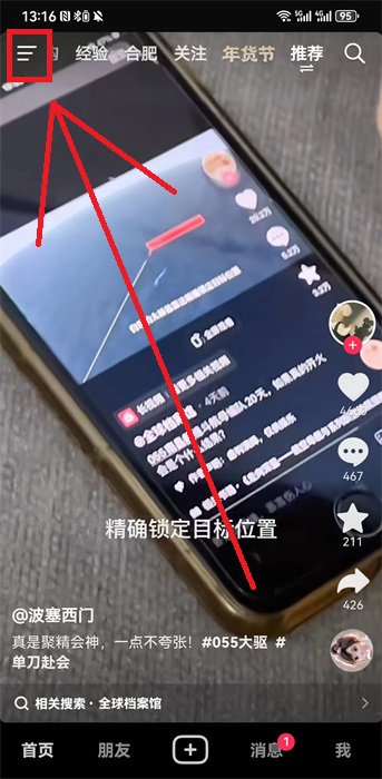 1、打开我们的抖音软件,在软件播放视频的主界面中点击左上角的【三】就可以弹出其他功能的界面;