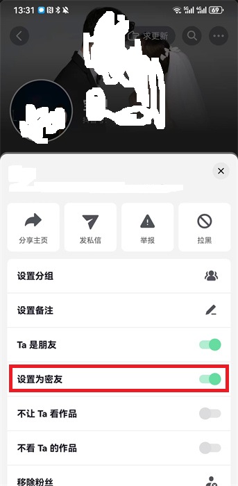 5、在弹出的功能之中,我们可以看到中间会有一个【设置为密友】功能,只需要打开右边的按钮,就可以吧对方设置成为我们的密友吗,但是需要对方同意才可以。
