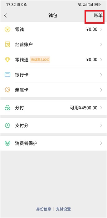 4、再接着就可以在钱包的界面中看到右上角有一个【账单】功能,进入其中去进行查询;