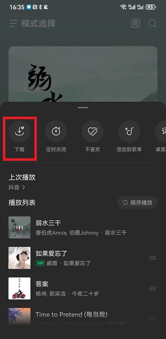 2、在弹出的界面中点击【下载】就可以下载音乐,如果是像下载指定的歌曲,就需要去搜索对应的歌曲名,进入到播放界面;