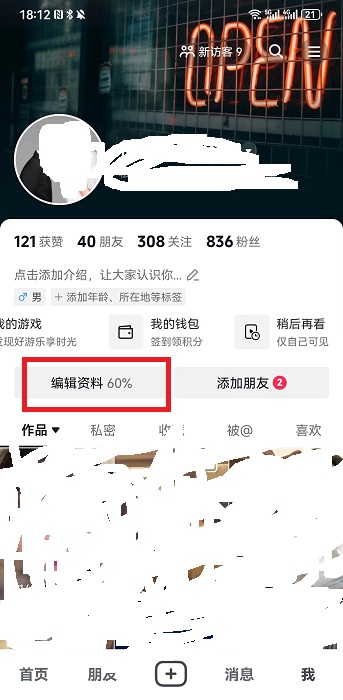 2、在主页中点击【编辑资料】去对自己的账号信息去进行编辑,完善自己的账号信息;
