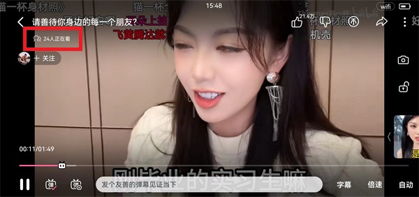 3、横过来视频之后,我们就可以做左上角看到目前正在观看的人数,实时的发生变化。