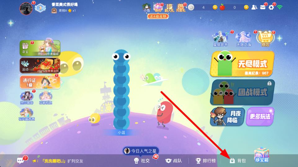 1、打开贪吃蛇大作战游戏,进入游戏主界面,点击底部导航栏中的背包选项,进入背包界面。