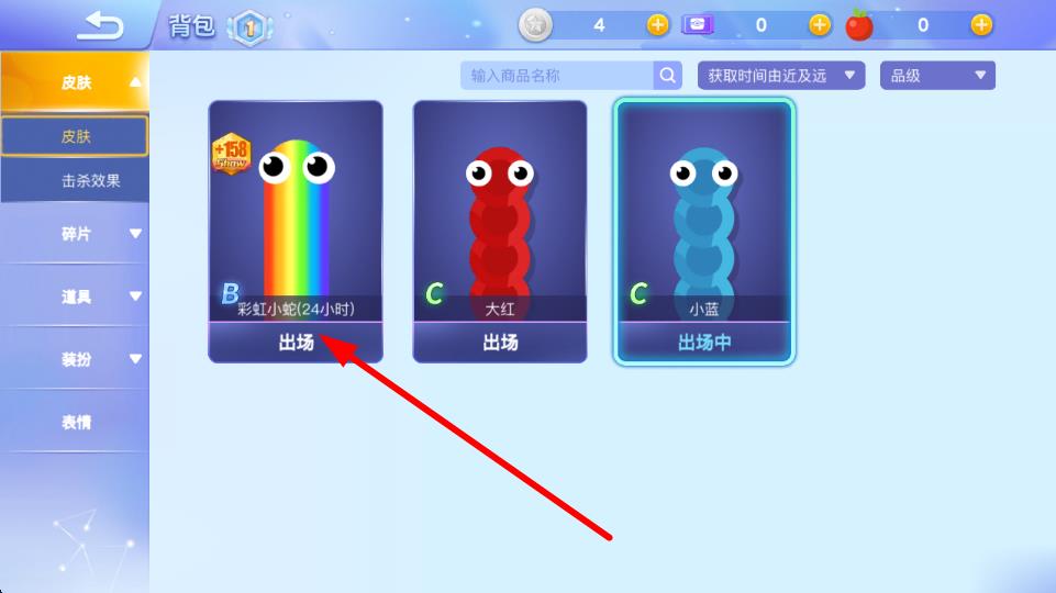 2、在背包界面的皮肤分类下,能看到已拥有的不同皮肤,选择想要更换的皮肤,点击皮肤下方的出场按钮。