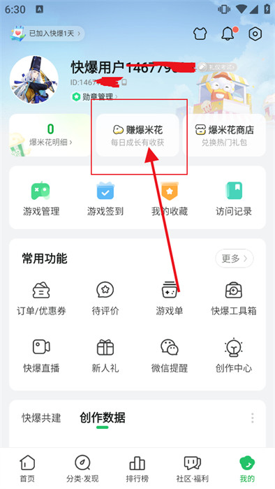 1、将软件打开切换到【我的】页面,找到最上方【赚爆米花】,如下图;