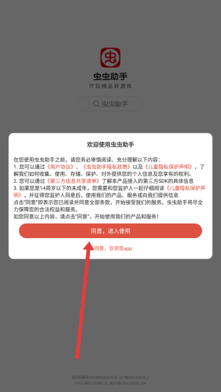1、打开虫虫助手,阅读隐私协议后点击红色同意按钮,进入应用开启游戏探索之旅。