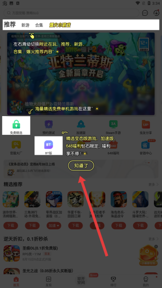 2、进入推荐页面,遇到精选游戏的提示弹窗,点击知道了按钮关闭,继续浏览内容。