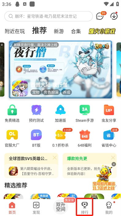 1、打开虫虫助手之后,在其首页界面我们可以点击下方的【排行】进入到平台的排行榜功能界面,以此为举例,给大家演示怎么安装游戏;