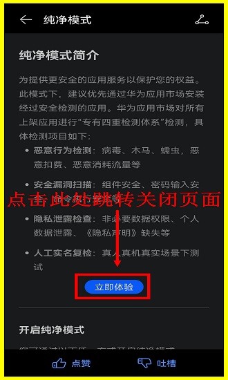 2.此处为纯净模式介绍,点击下方(立即体验)跳转关闭页。