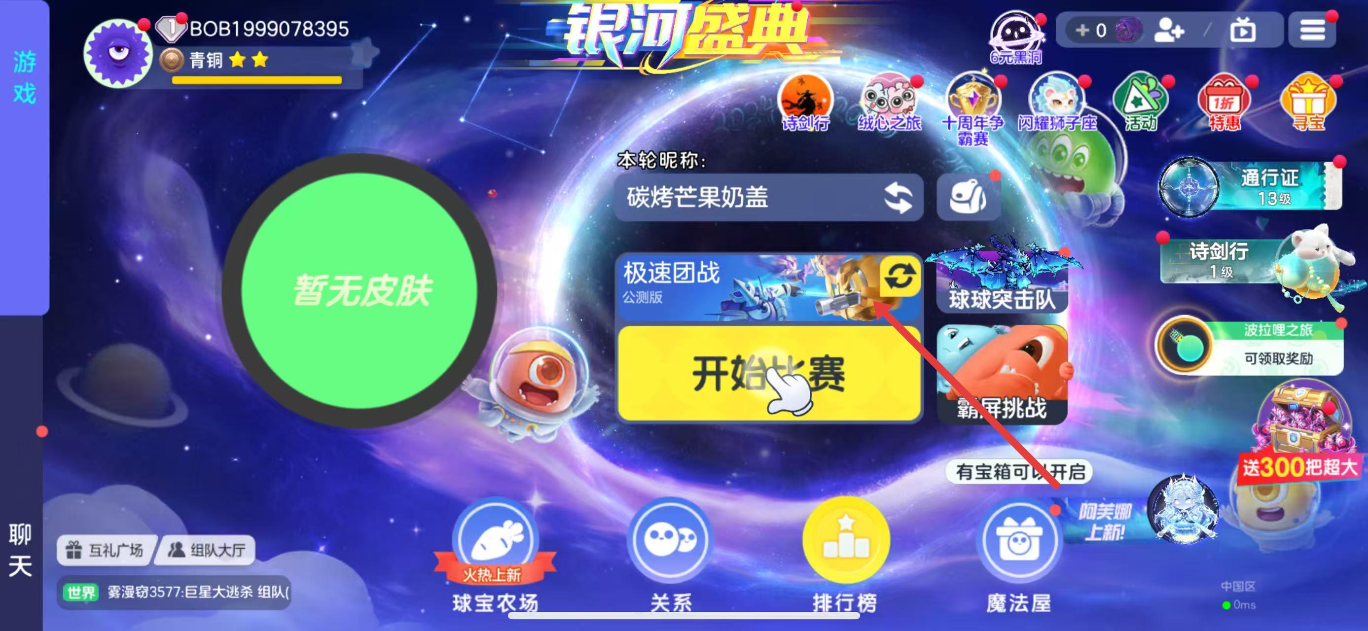 1、打开球球大作战进入主界面,点击极速团战旁切换按钮,选择休闲竞技,找到霸屏挑战模式进入。