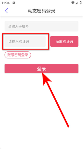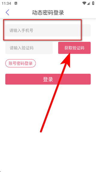3、在动态密码登录页面,输入手机号,点击获取验证码。