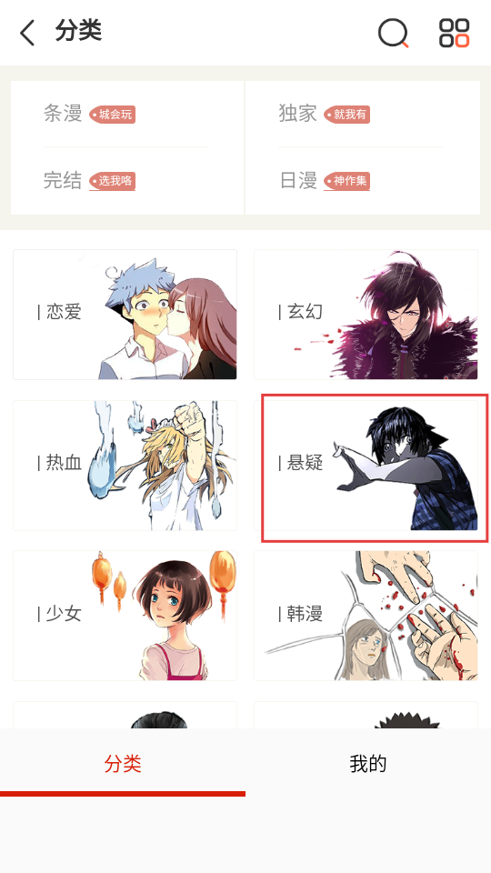 3、在分类页面,选择悬疑分类,进入悬疑类内容列表。
