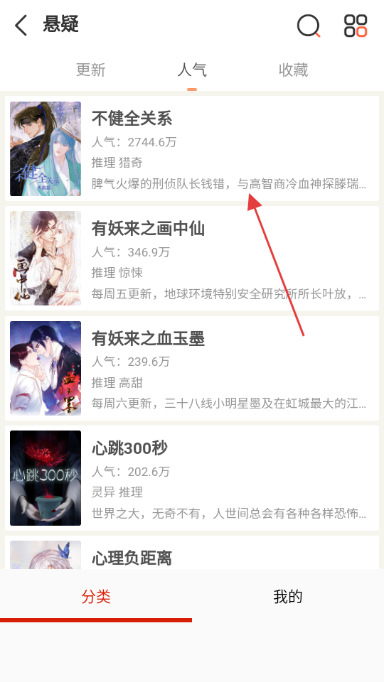 4、在悬疑类列表里,选择不健全关系,可阅读该作品相关信息。