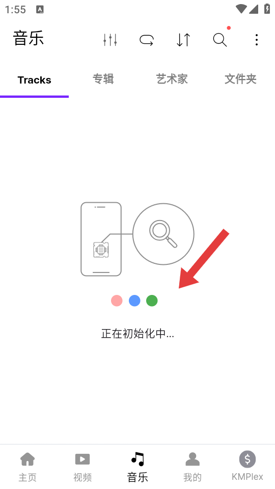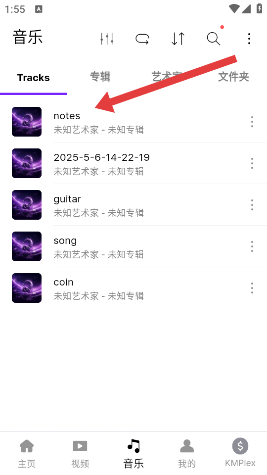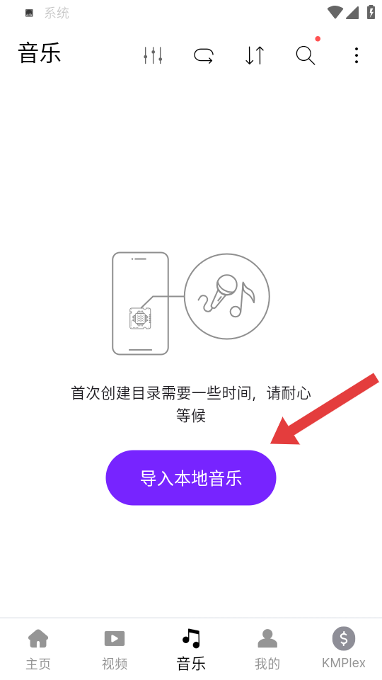 1、在KMPlayer主页,点击底部的音乐按钮,进入音乐管理页面。