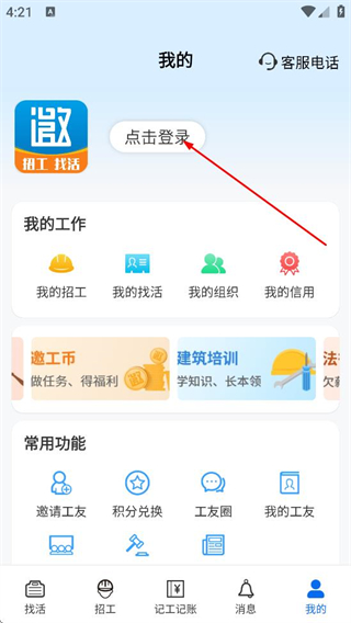 1、在邀工网首页,点击底部导航栏的我的,进入个人页面。