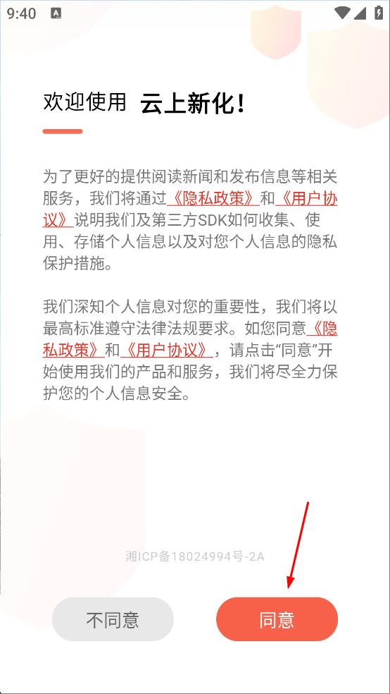 1、打开云上新化软件,在初始页面点击同意按钮,进入软件首页。