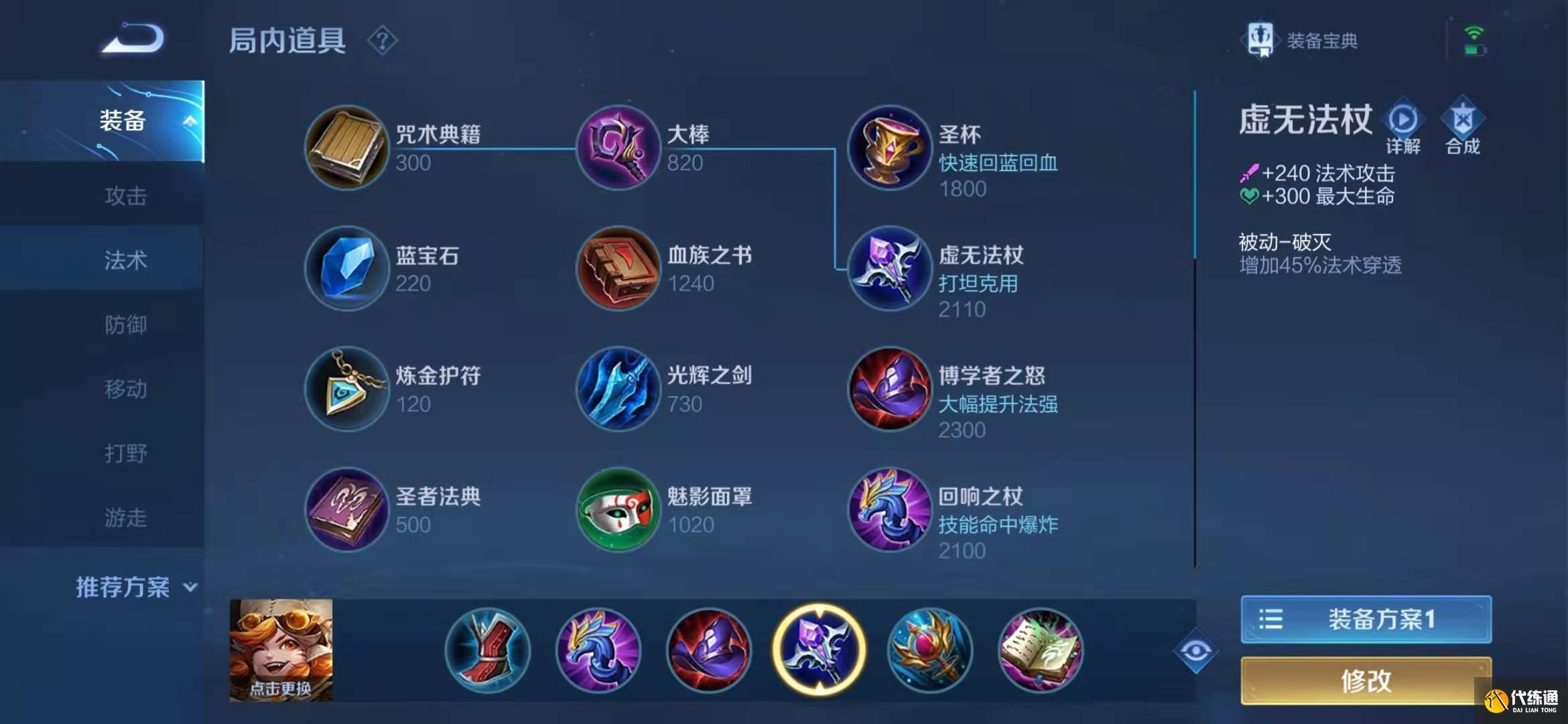 虚无法杖;同样增加法术穿透,,当对面的坦克出了魔女斗篷的时候,出了虚无法杖就是他们的克星,出完就去升级大血书。